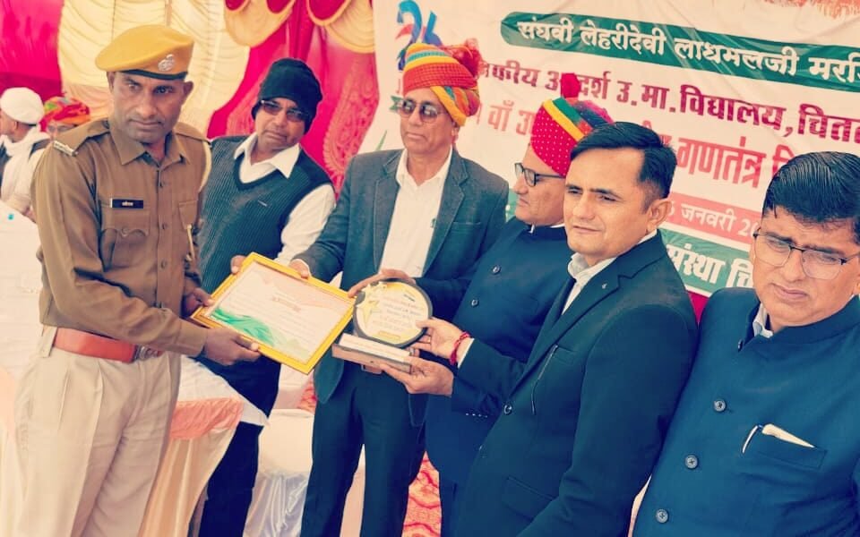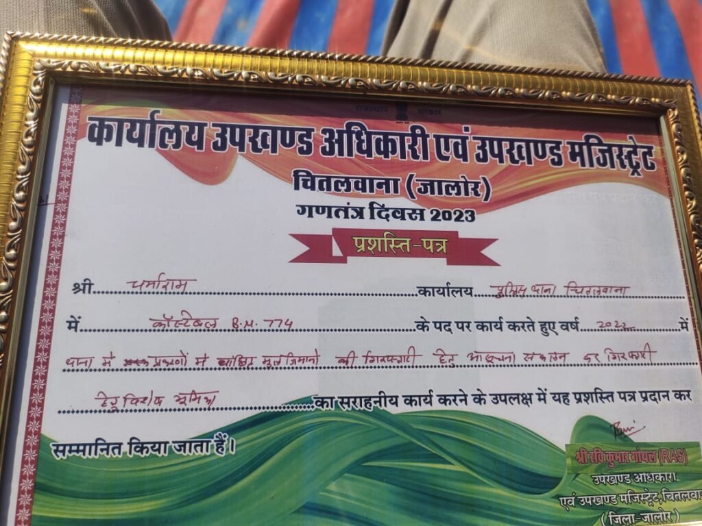 चितलवाना | क्षेत्र के चितलवाना में 74 वें गणतंत्र दिवस पर आयोजित उपखंड स्तरीय सम्मान समारोह 2023 में धर्माराम मेघवाल कॉन्स्टेबल को पुलिस थाना चितलवाना में वांछित मुल्जिमानो की गिरफ्तारी हेतु सीडीआर (कॉल ड्यूरेशन रिकॉर्ड) का गहनता से विश्लेषण कर गिरफ्तारी करवाने में विशेष भूमिका पर चितलवाना उपखंड अधिकारी रवि कुमार गोयल ने प्रशस्ति पत्र व मोमेंटो से पुलिस सेवा में सराहनीय कार्य करने पर सम्मानित किया गया।
