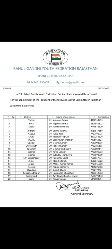 राहुल गांधी युथ फरडेरशन राजस्थान के जिला चूरू के जिला अध्यक्ष पद पर जगदीश प्रसाद घुघरवाल लूछ को मनोनीत किए जाने पर शीर्ष नेतृत्व का आभार व्यक्त किया गया।