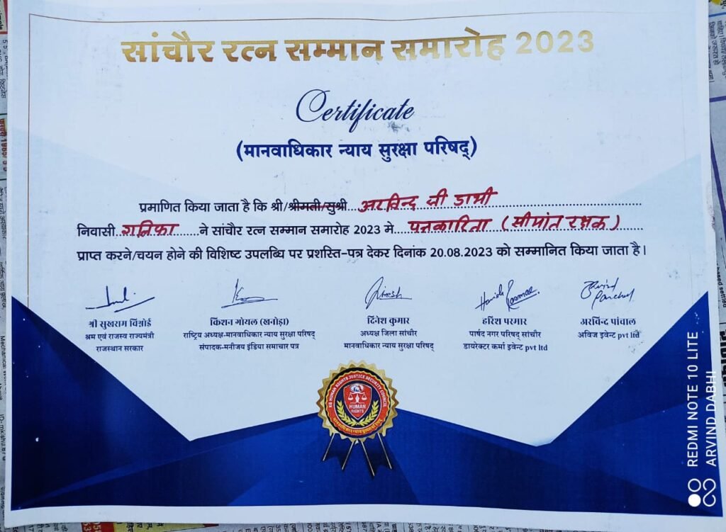चितलवाना/सांचौर | मानवाधिकार न्याय सुरक्षा परिषद जोधपुर के तत्वावधान में आयोजित प्रथम जिला स्तरीय सांचौर रत्न सम्मान समारोह में चितलवाना दैनिक सीमांत रक्षक न्यूज़ पत्रकार अरविंद डाभी को उत्कृष्ट पत्रकारिता के लिए सांचौर रत्न से सम्मानित किया गया।