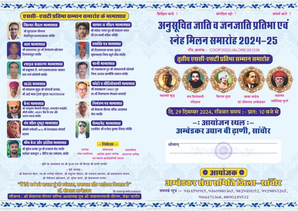 साँचौर | 29 दिसम्बर 2024 को अम्बेडकर सेवा समिति साँचौर के तत्वावधान में अम्बेडकर उद्यान बी ढाणी भीनमाल रोड़ साँचौर में आयोजित होंगा ।जिसकी सम्पूर्ण तैयारियांँ पूर्ण हो चुकी है ।