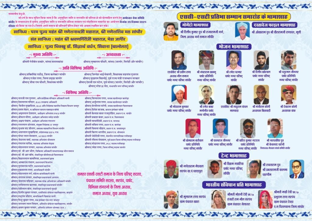 सेवा समिति के महासचिव कानाराम पारीक ने बताया कि तृतीय एससी-एसटी प्रतिभा सम्मान समारोह में दोनों वर्गो की 400 से अधिक प्रतिभाएँ सम्मानित होगी । इस समारोह में मुख्य अतिथि बनासकांठा सांसद श्रीमती गेनीबेन ठाकोर, अध्यक्षता श्री लुंबाराम चौधरी, अति विशिष्ट अतिथि के रूप में वड़गांव विधायक जिग्नेश मेवाणी, साँचौर विधायक जीवाराम चौधरी, पूर्व मंत्री सुखराम विश्नोई, पूर्व सांसद देवजी एम पटेल, जिला प्रमुख जालोर राजेश राणा, जिला कलेक्टर शक्तिसिंह राठौड़, नगर परिषद सभापति नरेश सेठ , एसडीएम देशलाराम परिहार, अतिरिक्त प्रादेशिक परिवहन अधिकारी पाली नानजीराम गुलसर आदि कई जनप्रतिनिधि व अधिकारीगण उपस्थित रहेंगे ।