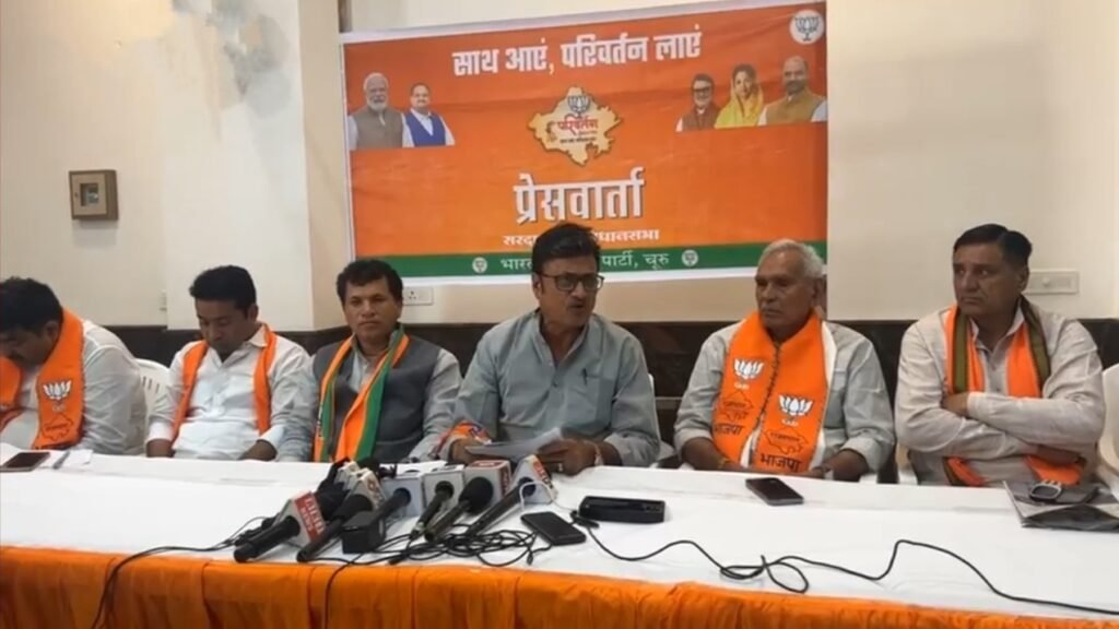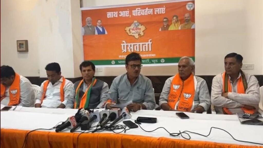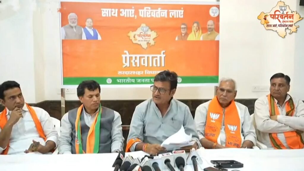 सरदारशहर | भारतीय जनता पार्टी की परिवर्तन संकल्प यात्रा की सभा के बाद दूसरे दिन गुरूवार को सुबह 10 बजे महिला मंडल के सभागार हॉल में भाजपा नेताओं ने प्रैस कॉन्फेंस करते हुए भाजपा नेताओं ने जमकर कांग्रेस पर निशाना साधा।