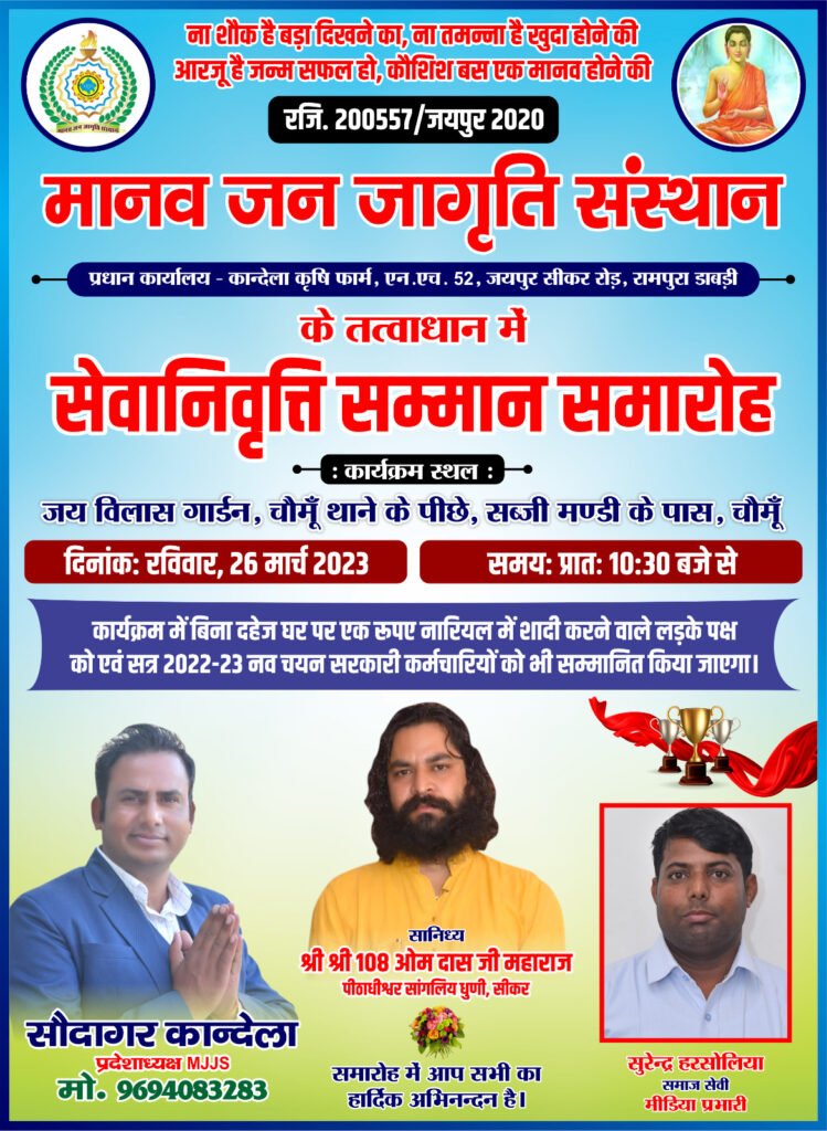 चौमूं | मानव जन जागृति संस्थान के तत्वावधान में रविवार को सुबह 10 बजे चौमूं थाने के पीछे जय विलास गार्डन में सेवानिवृत्त सम्मान समारोह होगा। संस्थान के प्रदेशाध्यक्ष सौदागर कांदेला व संस्थान के जिला मीडिया प्रभारी सुरेन्द्र सिंह हरसोलिया ने बताया कि समारोह सांगलिया धूणी सीकर के पीठाधीश्वर श्री श्री 108 ओमदास महाराज के सांनिध्य में आयोजित होगा।