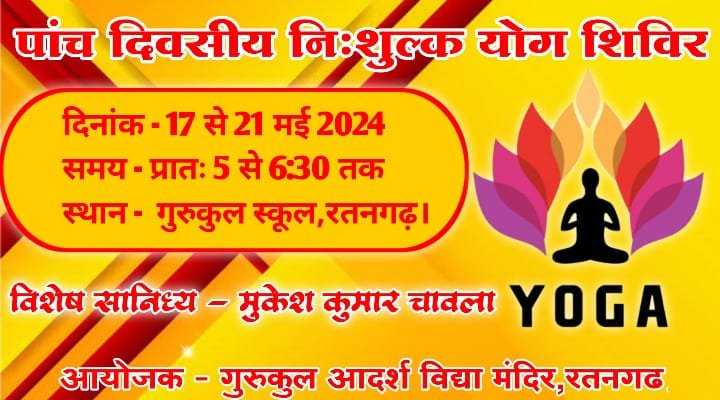 रतनगढ़ | गुरुकुल आदर्श विद्या मंदिर रतनगढ़ में 17 मई से 21 मई के बीच पांच दिवसीय नि:शुल्क योग शिविर का आयोजन किया गया। जिसमें विद्यालय के दर्जनों बच्चों ने प्रातः 5 बजे से 6:30 बजे तक नियमित योग अभ्यास किया।