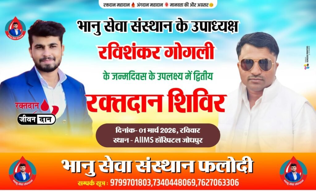 जोधपुर। AIIMS Jodhpur में रक्त की बढ़ती आवश्यकता को देखते हुए भानु सेवा संस्थान द्वारा 1 मार्च को रक्तदान शिविर का आयोजन किया जा रहा है। यह शिविर भानु सेवा संस्थान के उपाध्यक्ष रविशंकर के जन्मदिवस के अवसर पर आयोजित होगा।