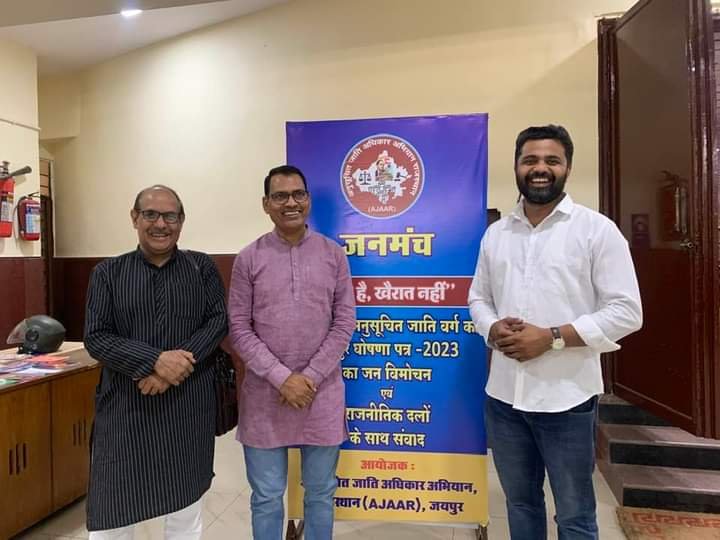 जयपुर | राज्य के अनुसूचित जाति वर्ग के संगठनों ने गुरुवार को आगामी विधानसभा चुनाव को लेकर “राजस्थान के अनुसूचित जाति वर्ग का जयपुर घोषणा पत्र-2023” जारी किया, राज्य भर से आई दलित महिलाओं के एक पैनल ने सुमन देवठिया और कांता सिंह के नेतृत्व में इसे जारी किया।