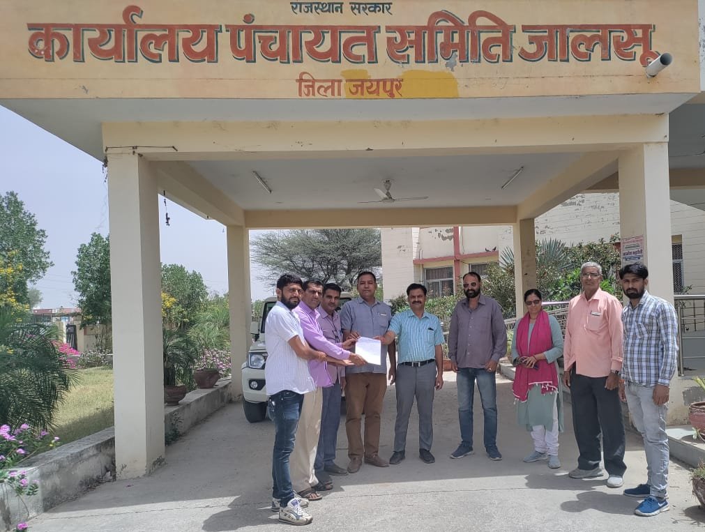 चौमूं | जालसू पंचायत समिति में राजस्थान ग्राम विकास अधिकारी संघ के प्रदेशाध्यक्ष महावीर प्रसाद शर्मा के आह्वान पर राजस्थान ग्राम विकास अधिकारी संघ के उपशाखा अध्यक्ष कालूराम जाट के नेतृत्व में सभी ग्राम विकास अधिकारियों ने जालसू सहायक विकास अधिकारी रतन लाल शर्मा को मुख्यमंत्री, मंत्री, मुख्य सचिव व अतिरिक्त मुख्य सचिव के नाम ज्ञापन सौंपा।