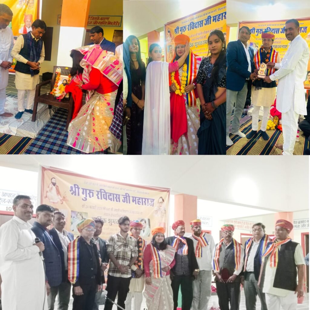 बीकानेर | श्री गुरु रविदास जी के जयंती के उपलक्ष में अनिल नोगौरी संगीत संस्थान नोखा में गुरु रविदास विश्व महापीठ राजस्थान की ओर से जयंती व विशाल भजन संध्या का आयोजन किया गया। इस अवसर पर श्री गुरु रविदास विश्व महापीठ राजस्थान टीम द्वारा श्री गुरु रविदास जी की तस्वीर पर माला व दीप प्रज्जवलित कर कार्यक्रम का शुरु किया जिसमे भजन संध्या में अनिल नागौरी पार्टी की ओर से शानदार भजन कार्यक्रम आयोजित हुआ। कार्यक्रम के दौरान वर्चुअल जुड़े कर रविदास आचार्य राष्ट्रीय अध्यक्ष सुरेश राठौड़ ने 647 वी जन्म अवतरण दिवस पर गुरु मंत्र से सबको हार्दिक शुभकामनाएं और आशीर्वाद देकर सभा को संबोधित किया।