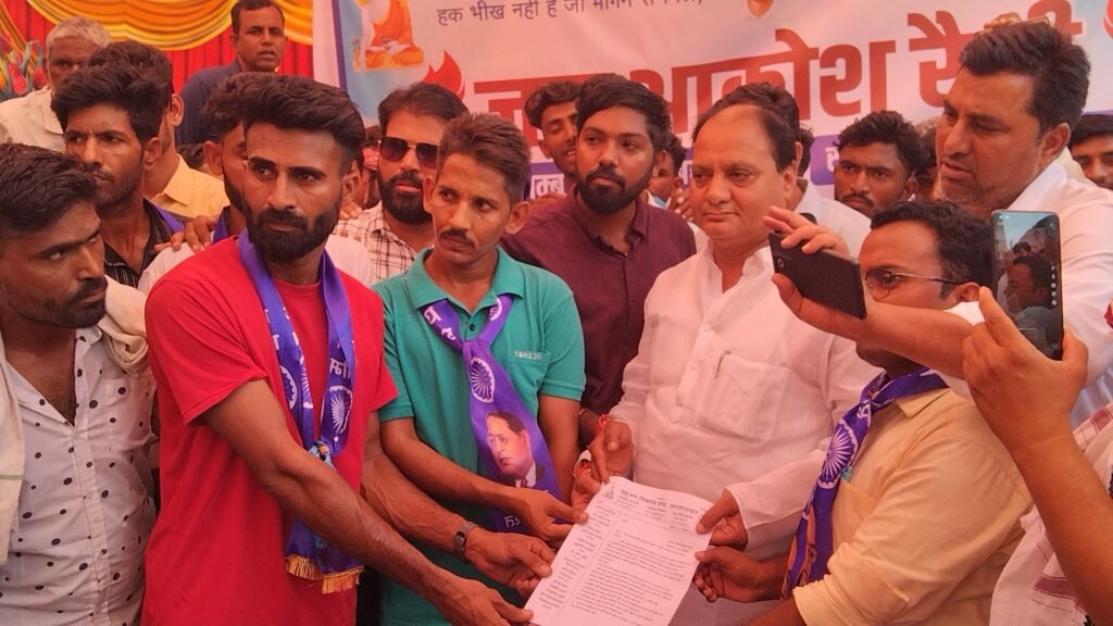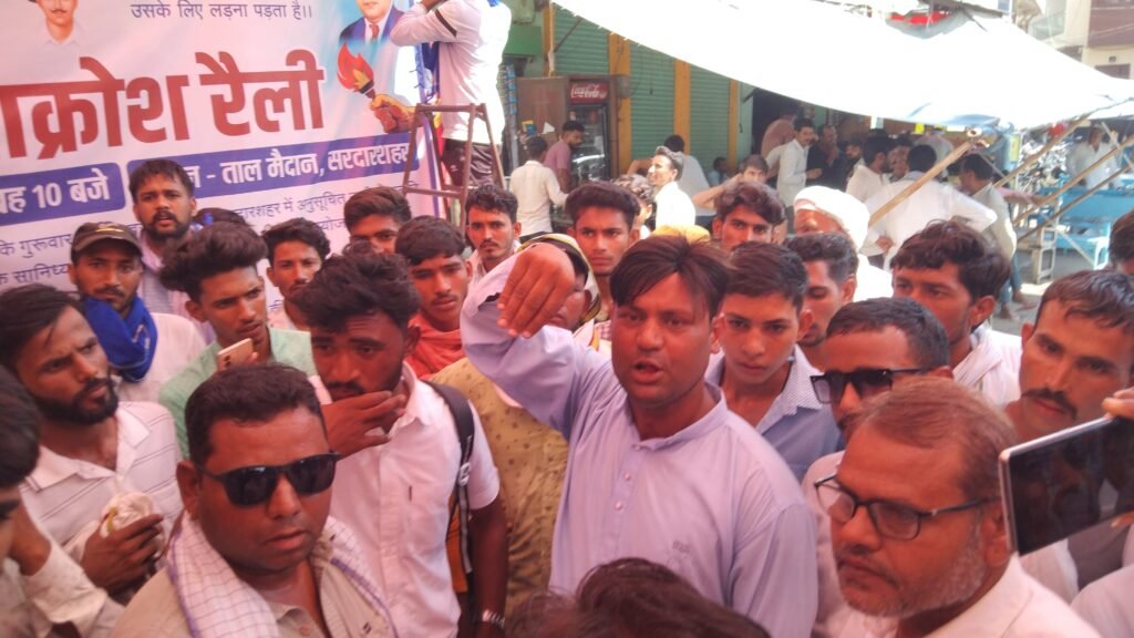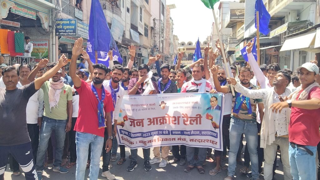सरदारशहर | बहुजन विकास मंच के बैनर तले ताल मैदान से गांधी चौक तक अपनी विभिन्न मांगों को लेकर गुरूवार को जन आक्रोश रैली निकालते हुए गांधी चौक पर विधायक अनिल शर्मा को ज्ञापन सौपा। बहुजन विकास मंच के द्वारा मुख्य मांग बापा सेवा सदन स्कूल एवं सर्वोदय छात्रावास सुचारू रूप से चालू करवाने व बाबा साहब के नाम से सर्किल बनाने, बापा सेवा सदन ट्रस्ट के द्वारा सरकार को दी गई भूमि में से 10 बिग्गा भूमि अनुसूचित जाति-जनजाति समाज के नाम आंवटित करने व सरदारशहर पुलिस थाने में एसी-एसटी समाज के लम्बित पड़े मामलों को जल्द निपटाने की की मांग रखी।