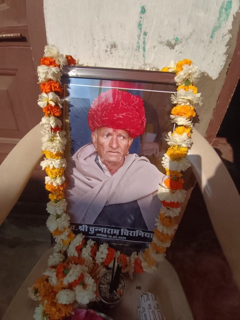 मेरे पूजनीय पिताजी श्री चुन्नाराम जी चिरानियां का असामयिक निधन दिनांक 16.02.2026 को रात्रि में 10.00 बजे ह्रदयाघात से हो गया था जिनकी छ दिवसीय बैठक दिनांक 21.02.2026 तक रखी गई तथा दिनांक 22.02.2026को सातवें दिन बिना मृत्यु भोज व बिना गंगाप्रसादी के कार्यक्रम सम्पन्न किया गया तथा किसी भी तरह की कोई ओढावणी व पहरावणी नहीं ली गई ।