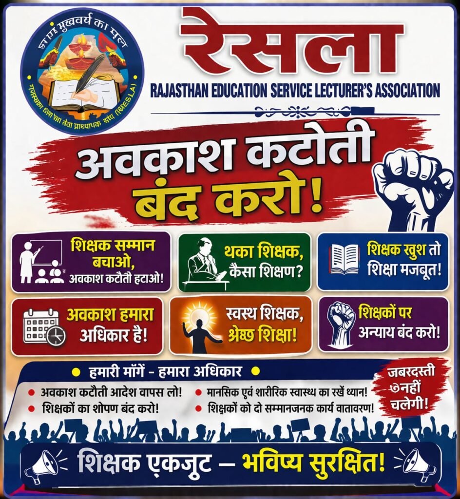 सरदारशहर। आज प्रदेश अध्यक्ष रेसला राजस्थान शिक्षा सेवा प्राध्यापक संघ के आह्वान पर रेसला ब्लॉक अध्यक्ष पवन शर्मा के नेतृत्व में समस्त विद्यालयों में सरकारी नीतियों के खिलाफ काली पट्टी बांधकर विरोध प्रदर्शन किया गया। उन्होंने बताया कि सरकार द्वारा शिक्षकों के अवकाश में की जा रही कटौती न केवल हमारे संवैधानिक और सेवा अधिकारों का हनन है बल्कि यह शिक्षा व्यवस्था की गुणवत्ता पर भी प्रतिकूल प्रभाव डालते हैं।