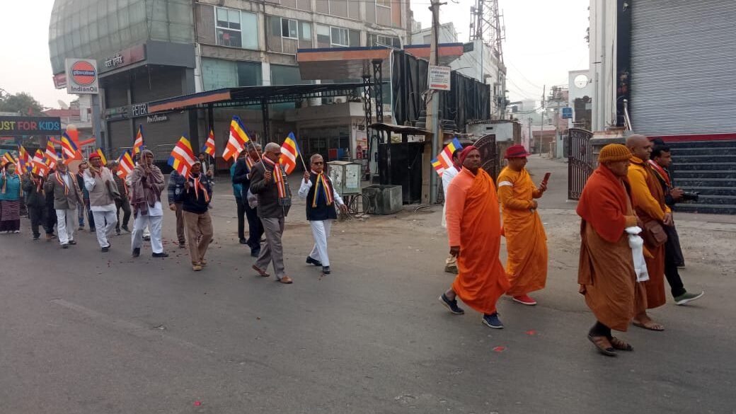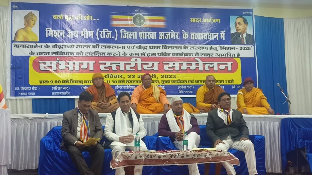 अजमेर | रविवार को “मिशन जय भीम” अजमेर शाखा के तत्वावधान में संभाग सम्मेलन संपन्न हुआ। जिसमें प्रातः 8 बजे अंबेडकर सर्किल से रवाना भिख्खुओ के सानिध्य में बैंड बाजा सहित धम्म यात्रा रेल्वे बिस्ट सभागार पहुंची।