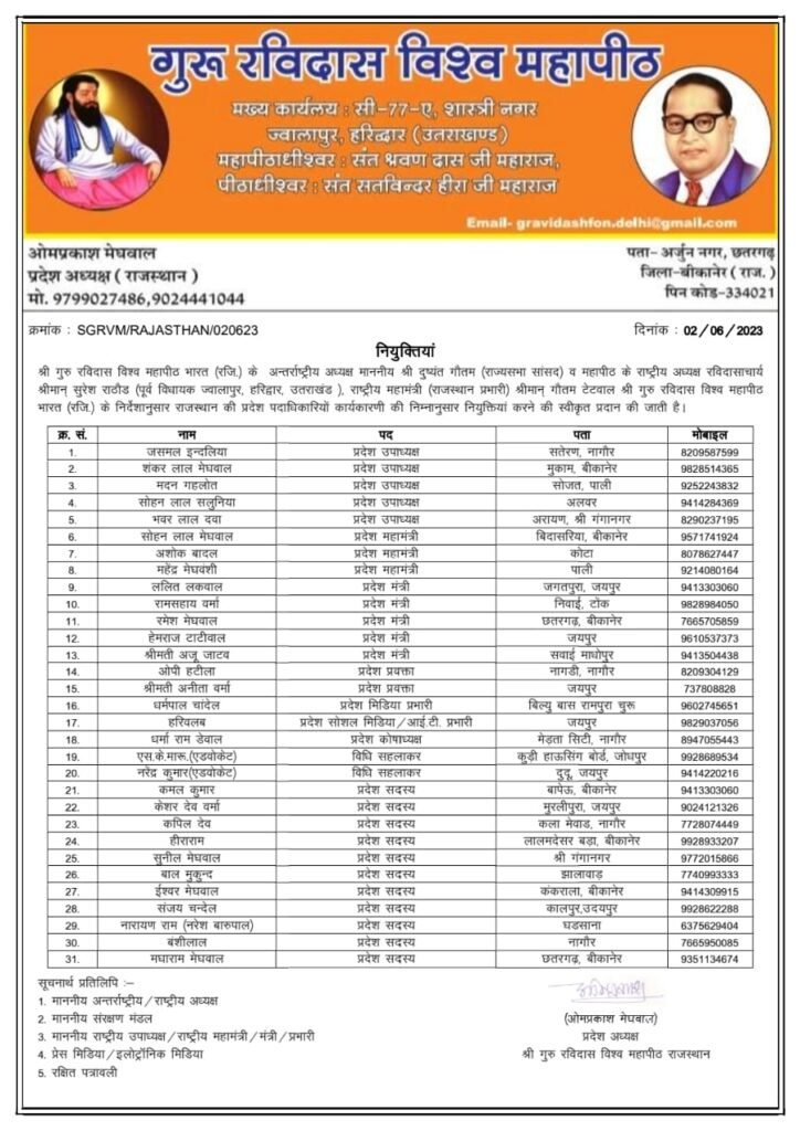 प्रदेश सोशल मिडिया / आई.टी. प्रभारी:- हरिवलब। प्रदेश कोषाध्यक्ष:- धर्मा राम डेवाल। विधि सहलाकर:- एस.के.मारू. (एडवोकेट), नरेंद्र कुमार (एडवोकेट)। प्रदेश सदस्य:- कमल कुमार, केशर देव वर्मा, कपिल देव, हीराराम, सुनील मेघवाल, बाल मुकुन्द, ईश्वर मेघवाल, संजय चन्देल, नारायण राम (नरेश बारुपाल), बंशीलाल, मघाराम मेघवाल आदि को नियुक्त किया गया है।