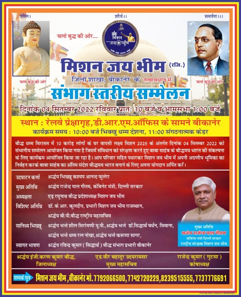 मिशन जय भीम के प्रदेशाध्यक्ष एडवोकेट रघुनाथ बौद्ध ने जानकारी देते हुए बताया कि मिशन जय भीम जिला शाखा बीकानेर के तत्वावधान में 4 सितंबर को कार्यक्रम होगा।