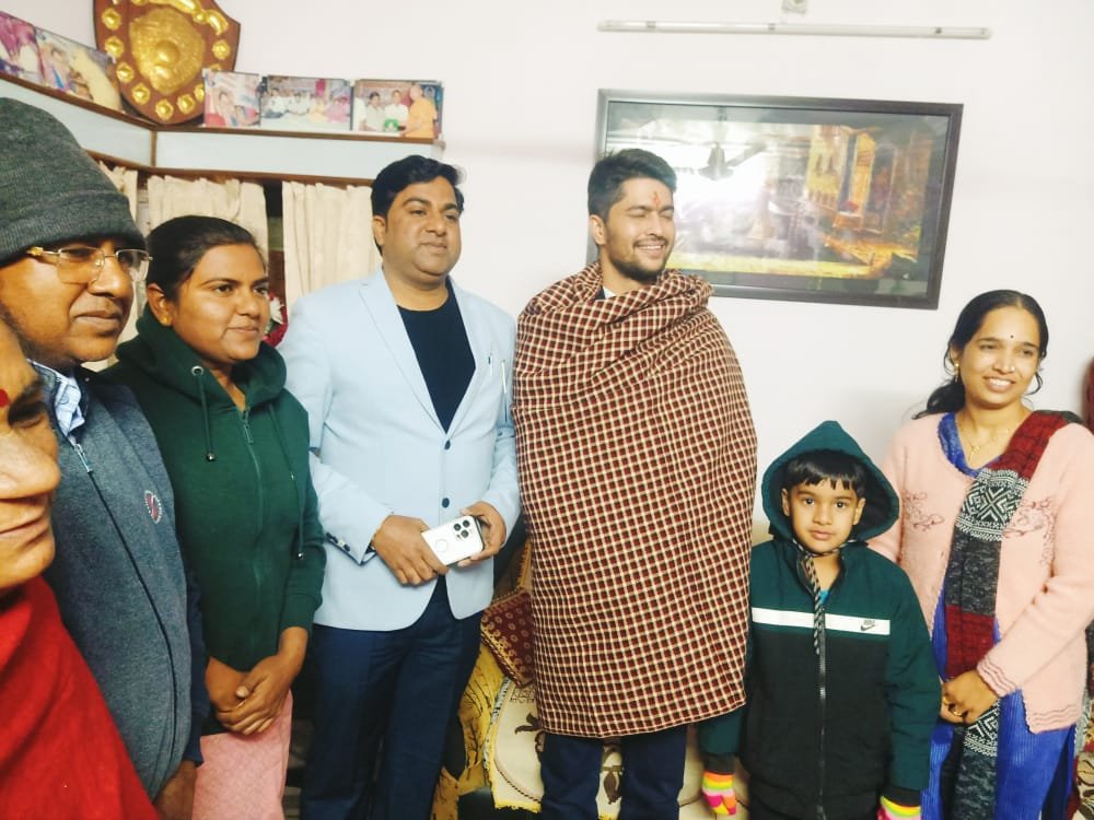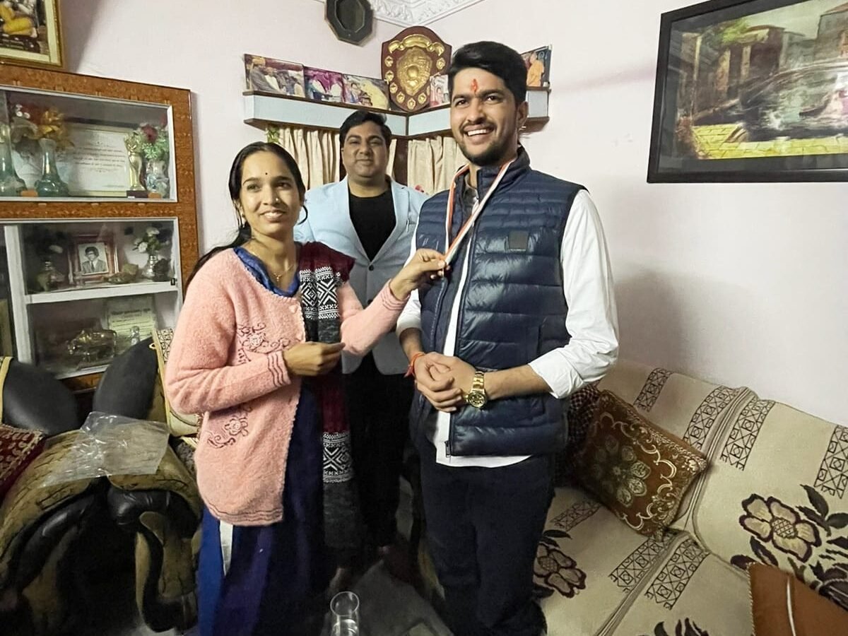 सम्मान व स्वागत के क्रम में गुरू प्रियंका मंडार ने अपने शिष्य का साफा, व माल्यार्पण तथा चांदी का मेडल पहनाकर स्वागत व सम्मान किया गया।
