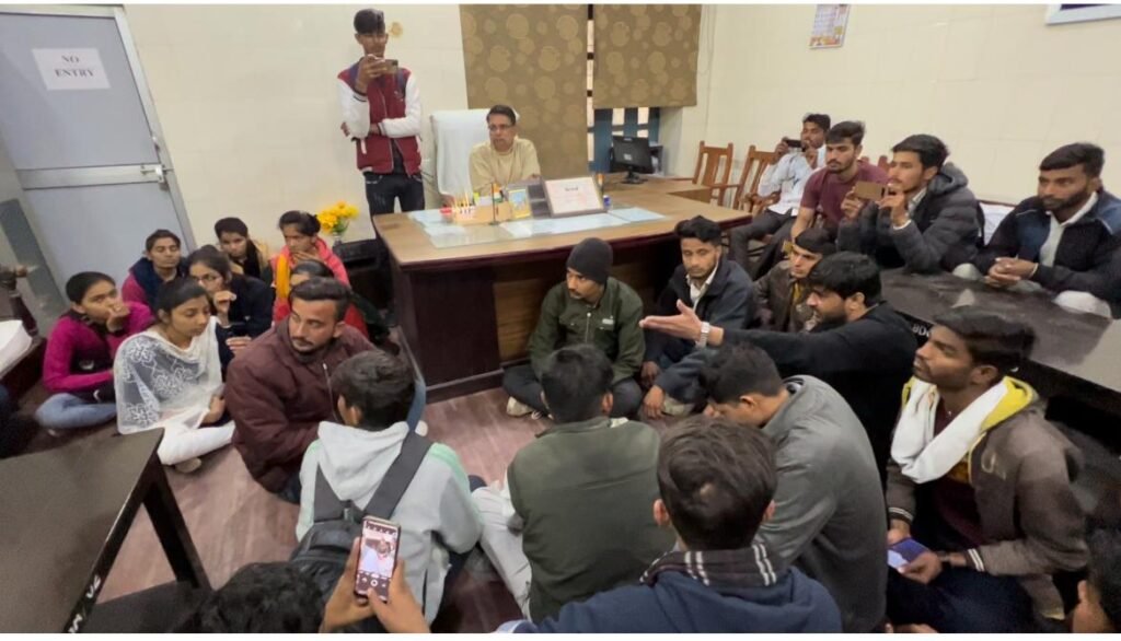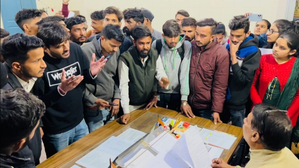 इस दौरान एनएसयूआई के पूर्व जिला अध्यक्ष किशनलाल सिंवर ने बताया कि कॉलेज के स्वयंपाठी विद्यार्थियों के लिए परीक्षा केंद्र पुनः खोला जाए। साथ ही स्वयंपाठी विद्यार्थियों से 12वीं की मूल अंक तालिका जमा नहीं ली जाए। इसके अलावा परीक्षा फॉर्म भरते समय विश्वविद्यालय द्वारा गुणा की व्यवस्था समाप्त की जाए और विश्वविद्यालय द्वारा फॉर्म की फीस बढ़ाई गई है, जिसे वापस लिया जाए। इसके अलावा योग्यता के नाम पर राजस्थान बोर्ड के छात्र-छात्राओं से विश्वविद्यालय द्वारा 200 रुपए शुल्क वसूला गया है। उसको तत्काल वापस लौटाया जाए। साथ ही परीक्षा फार्म जमा कराने के लिए खिड़कियों की संख्या चार की जाए। इन सभी मांग को लेकर हमने प्राचार्य को ज्ञापन दिया है। इस दौरान मांगें नहीं माने जाने पर छात्र प्राचार्य कक्ष में करीब 2 घंटे तक धरने पर बैठे रहे।
